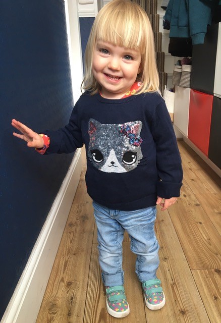 She is now 2 and a half and still a very calm and happy toddler who is very chatty. She’s still on the smaller side, and a bit wobbly on her feet, but she’s catching up fast with her sisters.